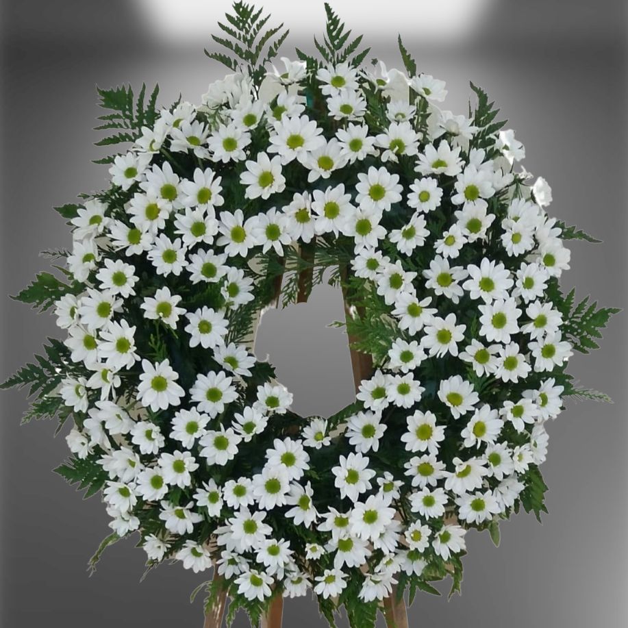 Corona solo de margaritas blancas y relleno de verdes variados.